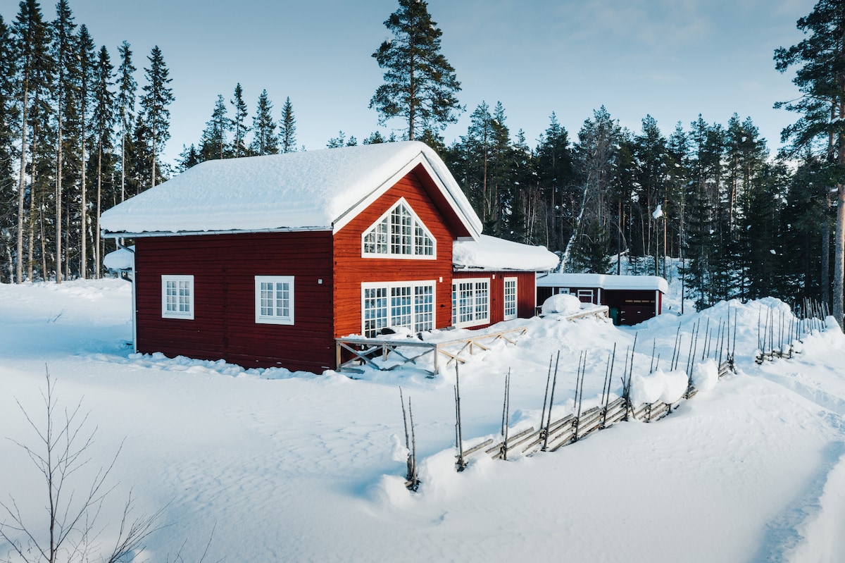 Naša moderna drvena kuća nalazi se na samoj obali jezera. Dizajn otvorenog koncepta s mnogo drveta i svjetla stvara toplu, prijateljsku atmosferu. Na 85 m2 ćete pronaći panoramske prozore s fantastičnim pogledom na jezero, kamin od sapuna, dvije spavaće sobe i kupatilo. Uživajte u ribolovu, veslanju, plivanju, planinarenju i skijanju ispred svog praga! Naša susjedna mala farma s našom djecom, tri psa za sanjkanje, tri mačke, vrt i pilići mogu izazvati iskustvo odmora na farmi.