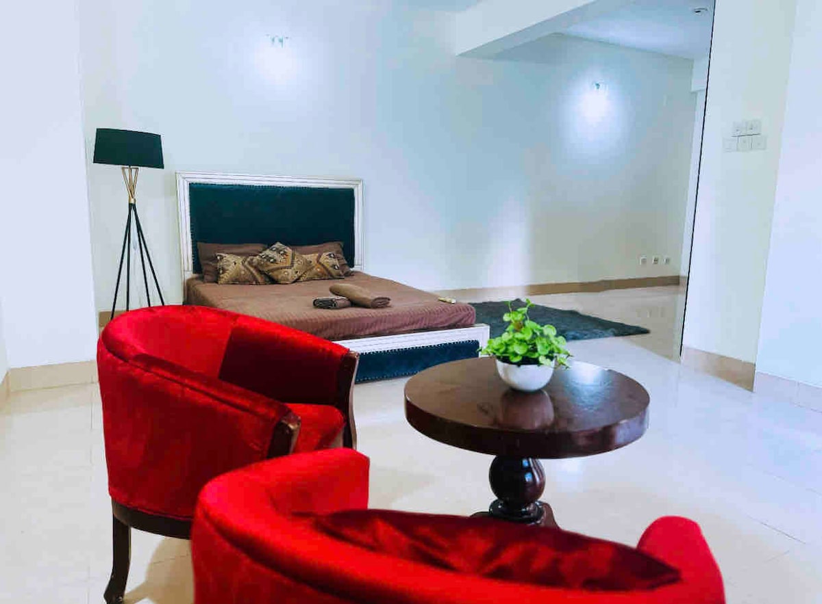 1600 sq feet apartment with top quality fittings. Clean and airy and only 2 mins walking distance from Pizza Hut/Star kabab and Abahoni field. Near all major shopping and eating outlets. Running water, gas, hot water, AC and good quality WiFi. Kitchen, fridge , microwave with all basic cookware.