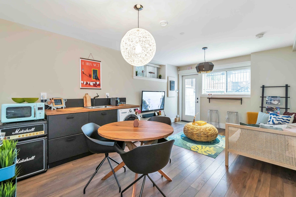 Private entry & space : 500 square feet ( Nothing is shared with anyone ) with a quiet neighbourhood. Stay includes: ▩ Fun: LG 4K OLED TV + Apple TV + 4K Netflix + Marshall speaker + 1 Gbps WIFI ▩ Hot: Air Conditioner + Dyson fan ▩ Cold: Floor heat + Nest thermostat ▩ Bar: Microwave + Fridge + Nespresso + Starbucks capsules + Water Filter ▩ Clean: 2 in 1 LG Dryer/Washer + Toto washlet + Sanitizer ▩ Commute: 7min walk to restaurant/bike lane/walk to transit. 20min drive to YVR / Downtown