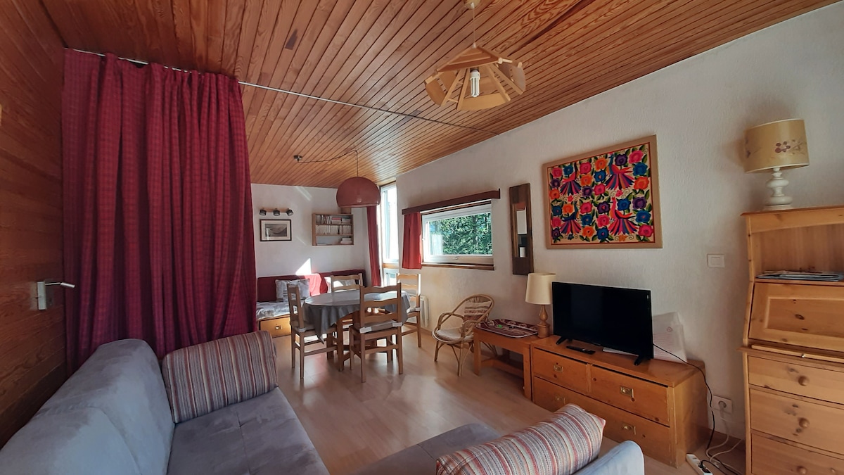 Šarmantni mali studio od 20 m2, nalazi se u podnožju padina (50 metara) i prodavnica s besplatnim parkingom. Sastoji se od: - dnevna soba s TV-om - mala terasa suspendovana u zelenom okruženju - zatvoreni planinski kutak s krevetima na sprat i malim ormarom - prostrano kupatilo s tuš kabinom i WC-om - mali prostor za kuhanje, koji se sastoji od sudopera, mikrovalne pećnice/rerne, malog frižidera i uklonjive električne ploče za kuhanje.