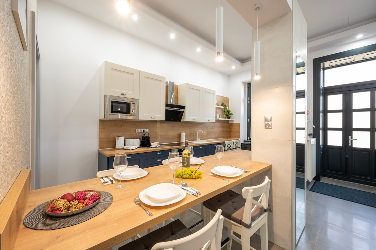 Stilska buržoaska elegancija, jedinstven, čist dizajn, veliki prostori u kojima, pored luksuza, igra ulogu i udobnost. Moderni, potpuno opremljeni apartman vrhunskog kvaliteta površine 82 m2. Direktno na glavnom trgu Szombathelya, s pogledom na statuu Svetog Trojstva. U privatnoj sauni apartmana možete se napuniti novom energijom. Centar grada je ispred naših vrata, na dohvat ruke od vas!Kod nas ćete pronaći sve što vam može biti važno tokom boravka. Osjećajte se kao kod kuće.