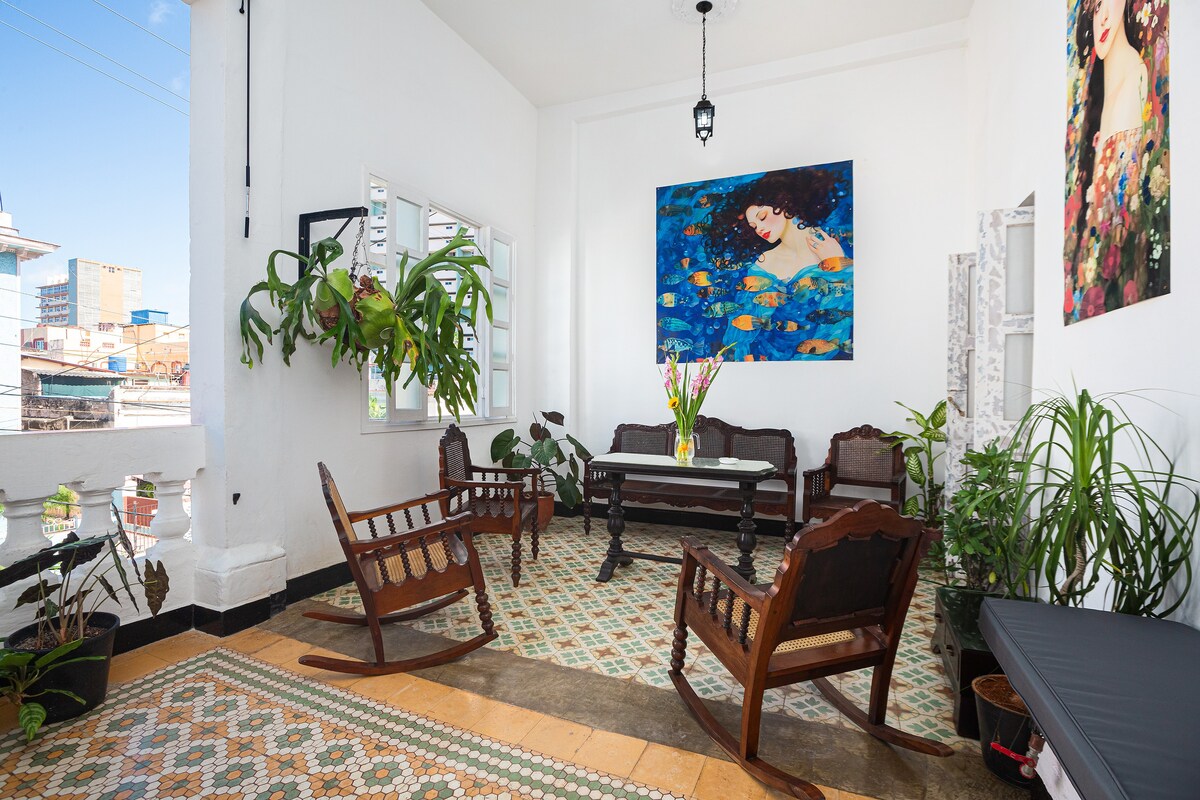 Sensacional espacio en el Vedado, a dos pasos del Malecón, con vistas a la ciudad y el mar, le invitamos a relajarse y aislarse del bullicio citadino, gracias a la espaciosa terraza que domina el barrio. Una habitación, salón y baño independiente. Cama King size que puede separarse en dos camas twin . WIFI gratis . Contamos con paneles solares y baterías que permiten tener electricidad y funcionamiento de los equipos menos los AC. Para esta situación tenemos ventiladores que podrás utilizar.