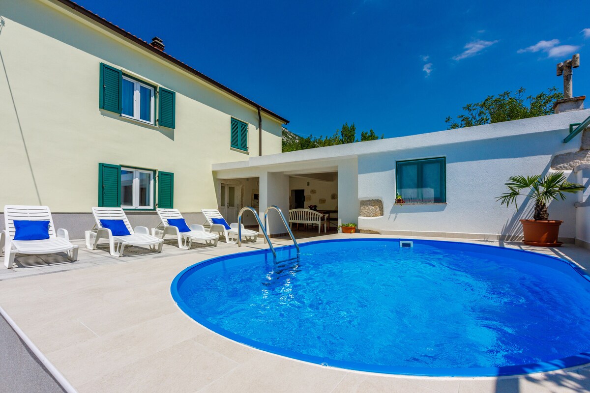 Ako tražite kuću za odmor s izvanrednim panoramskim pogledom, ovo je dom u kojem možete boraviti. Kuća pruža savršenu privatnost jer je u potpunosti okružena drvećem. Uživajte u ljepotama prirode i bazenu ( 42 m2 ) s čarobnim pogledom. Najbliža plaža je Jadranovo (1,9 km), a za 3 minute automobilom ćete biti na mostu za Krk ili na ulazu na autoput.