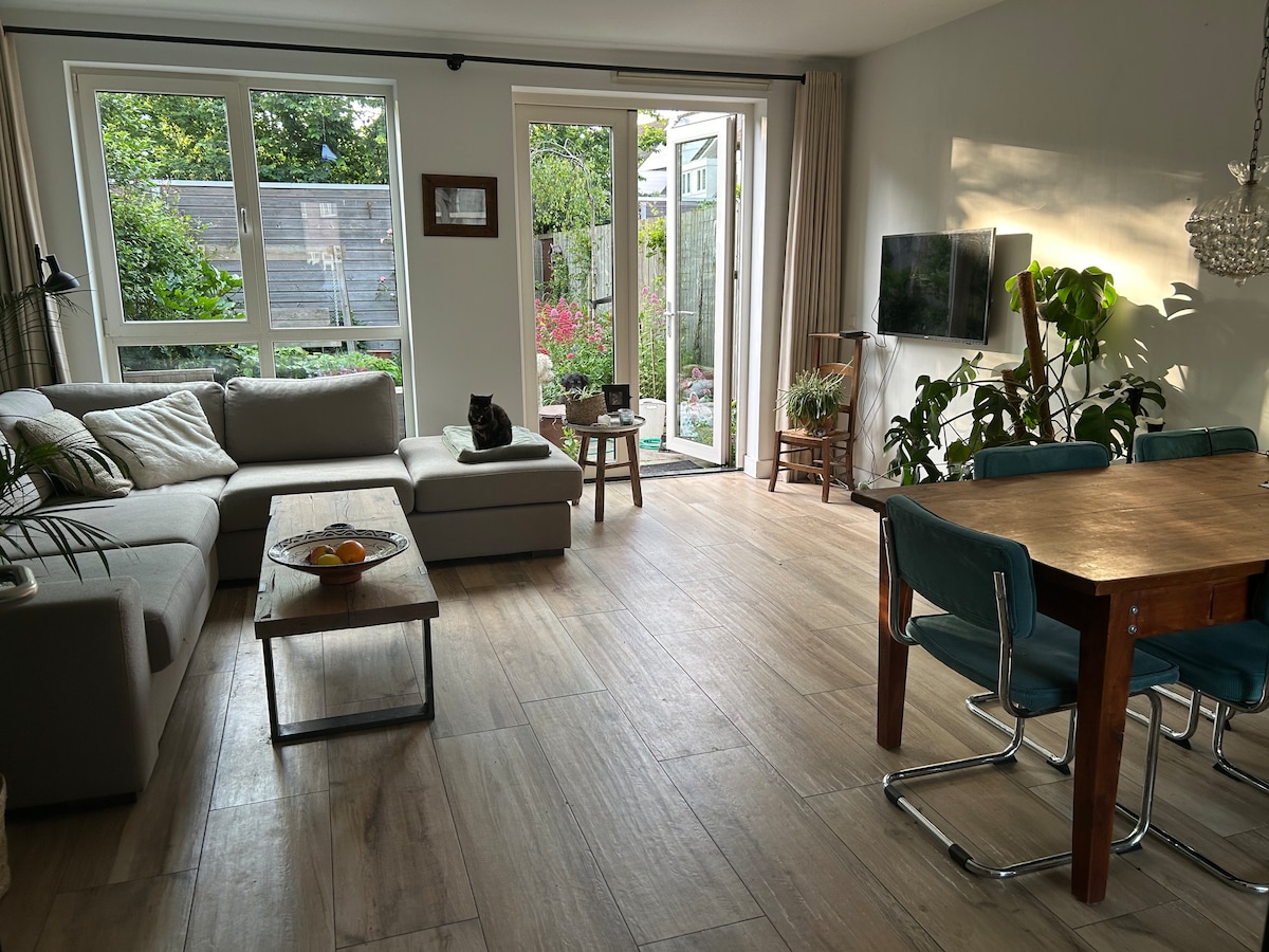 Moderna porodična kuća sa super prostranim dnevnim boravkom. 2 spavaće sobe, novo kupatilo. Duboko dvorište, opremljeno svim pogodnostima. Kuća se nalazi u nizu kuća u vrlo mirnom susjedstvu. Željeznička stanica udaljena 4 minute hoda. Ulaz u Nacionalni park Kennemerduinen udaljen je 10 minuta hoda. Opustite se i uživajte u dinama i moru. Parking je besplatan ispred vrata. Selo Santpoort ima ugodnu trgovačku ulicu, a Haarlem je odmah iza ugla. Amsterdam je udaljen 20 minuta vožnje vlakom