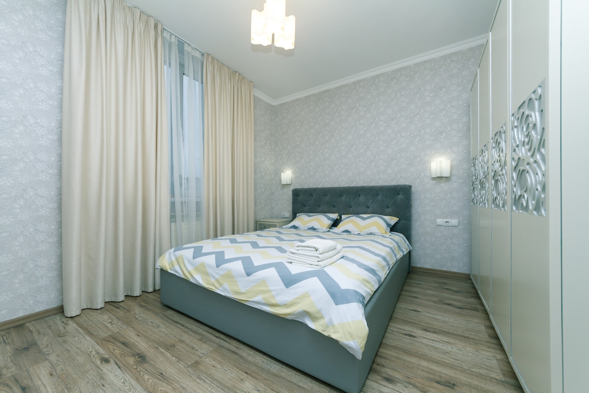 Sunny and warm apartment, completely new. At the disposal of guests everything you need. Kitchen dishes, towels, bedclothes, hair dryer, household appliances are all brand new. The apartment is located in the center of the Rusanovka district, an artificial island surrounded by water. A five-minute walk the river embankment with a many restaurants with varied cuisine - Italian, Greek, American, European, one fish and one breakfast restaurants. The exhibition center (IEC-expo) is a 15-minute walk.