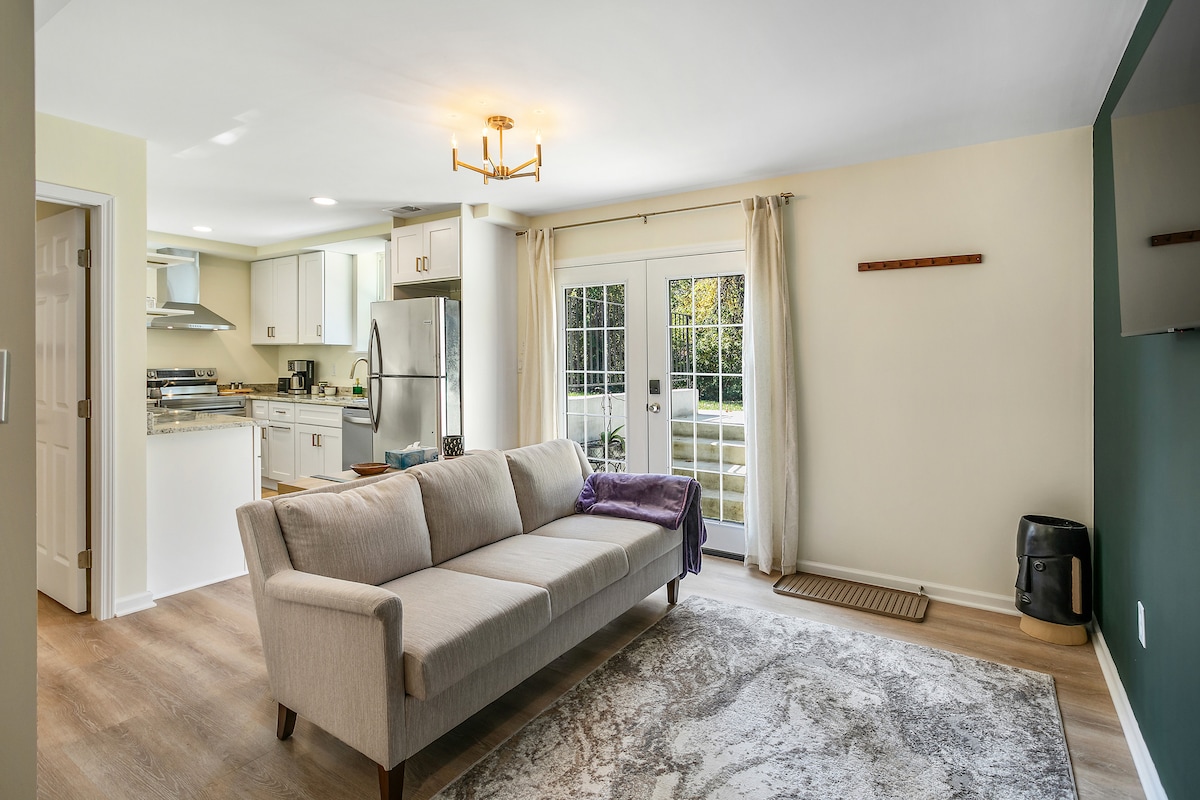 Private 1BR/1BA guest suite/apartment (600 sf) in a brand-new single-family home. The guest suite is located on the upper level of the house and is accessible by elevator from the mudroom when you enter through the front porch. It feels like a private one-bedroom apartment, complete w a cozy living area, a bedroom, and a kitchen. The kitchen is fully equipped with a full-size refrigerator, dishwasher, microwave, countertop electric burner, coffee maker, kettle, utensils, plates, cups, glasses.