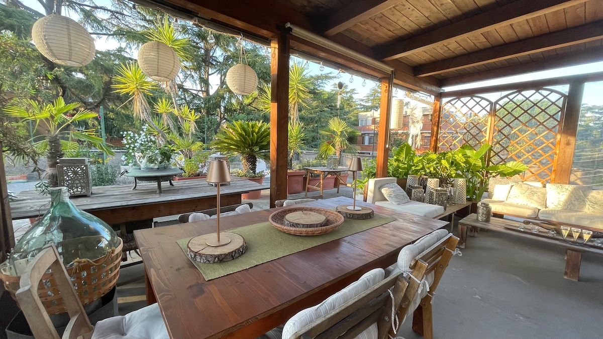 Ovo jedinstveno rustikalno, ali elegantno potkrovlje je puno detalja od drveta, metala i kamena, a sve je to napravio Giulio, njegov vlasnik. Fantastična terasa će vam oduzeti dah. Šta kažete na kafu sa papučama dok razmišljate o Koloseju ili promatranju zalaska sunca iza vatikanske sjene iz kolibe? Nalazi se nekoliko minuta od stanice Termini, ali je i dalje miran dom. Pristup stanu se vrši stepenicama. Doručak je na naš račun!