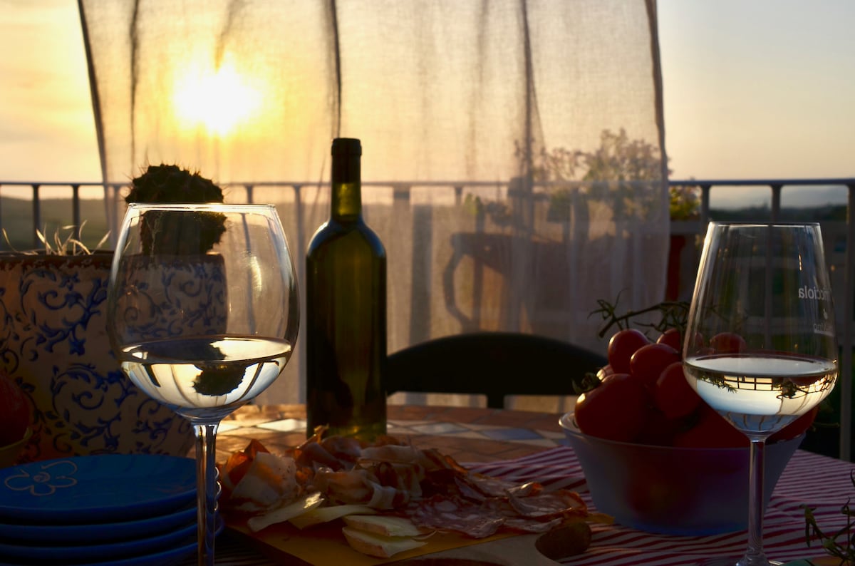 Immagina di svegliarti con le colline ornate di borghi e campanili a perdita d'occhio oltre la finestra della camera da letto: un'alcova con soffitti spioventi, travi e travicelli, pavimento in legno, in cima ad un antico casolare. Immagina da ogni affaccio della casa il sole che splende sulle vigne, oppure immagina il verde acceso degli uliveti dopo la pioggia primaverile oltre la grande terrazza adiacente alla cucina.