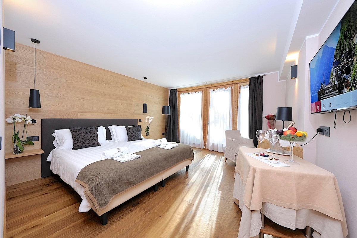 This room at Hotel Vallecetta offers a cozy atmosphere, featuring alpine-style décor with wooden furnishings. Each room has a private bathroom with a shower, hairdryer, Wi-Fi, and satellite TV. The design blends traditional alpine charm with modern comforts, creating a relaxing space ideal for couples, with extra beds available for families. A generous breakfast is always included ensuring a perfect day!
