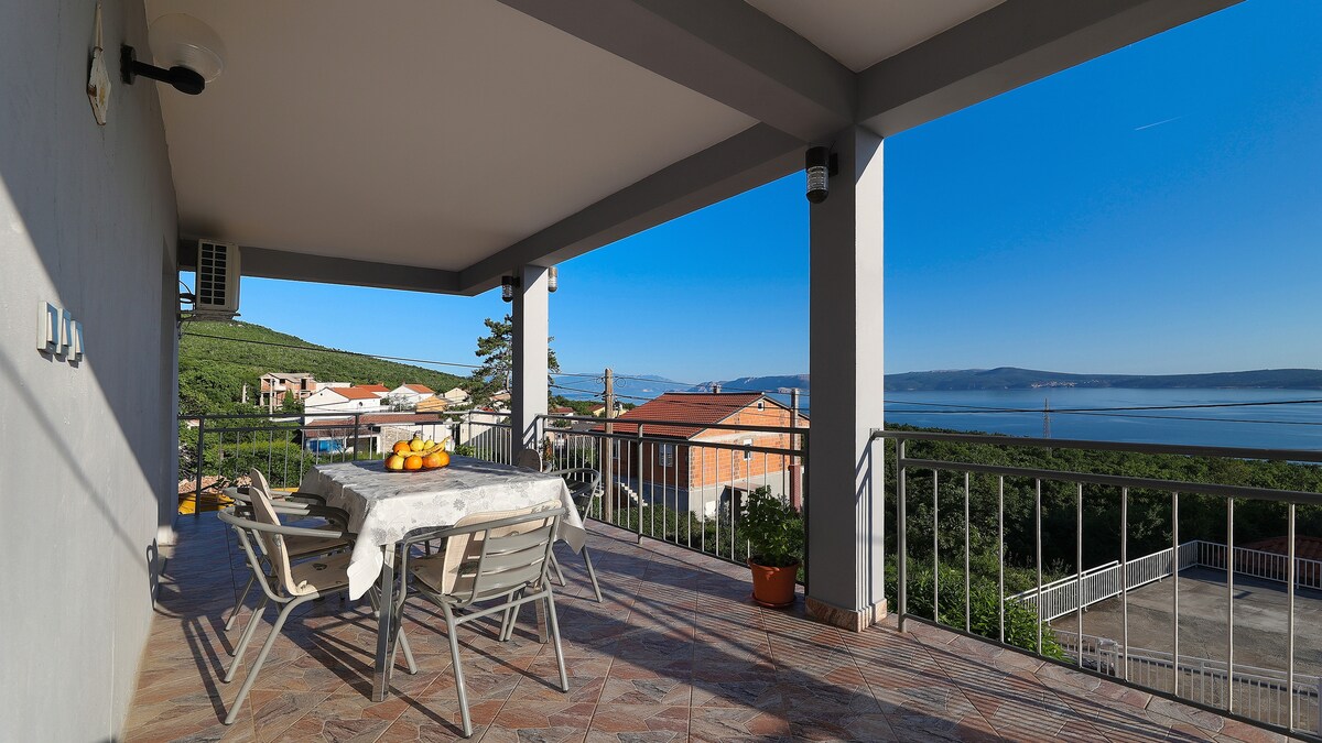 Kompletno opremljen apartman u mirnom predjelu Crikvenice s pogledom na more. Parkiralište u dvorištu objekta, mogućnost korištenja grilla kao i terase uz grill.