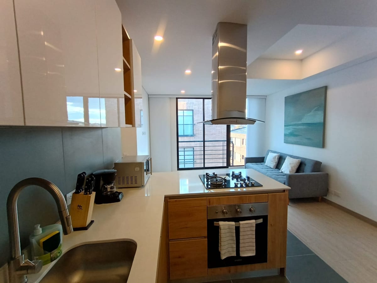 Uživajte u ovom modernom i udobnom luksuznom potkrovlju. Nudi bračni krevet (Queen), sofacama, Wi-Fi, Smart TV i opremljenu kuhinju (uključujući kafu). Nalazi se u novoj zgradi, nekoliko koraka od Transmilenia, parkova, restorana i pozorišta. Opustite se uz pogled na zalazak sunca ili radite u svojim coworking prostorima. Pristupite terasi s roštiljem, prostorom za vježbanje i TV sobom. Osiguranje 0-24 i neobavezno parkiranje. Prikladno za kućne ljubimce. Rezervišite i živite Bogotu sa stilom!