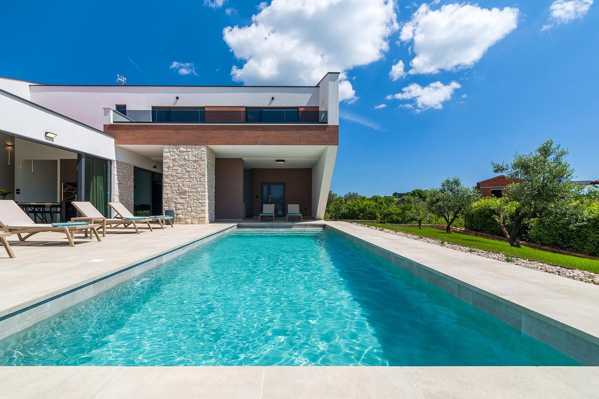 Potpuno nova luksuzna dizajnerska vila koja se nalazi u srcu mirnog sela Bale u Istri, Hrvatska. Uživajte u miru i tišini u dnevnom boravku u otvorenom prostoru s prekrasnim pogledom na srednjovjekovno selo. Kuća ima prekrasan, uređen vrt, okružen prirodom. Plivajte u grijanom, vanjskom bazenu ili se opustite pored bazena u hladu stare masline.