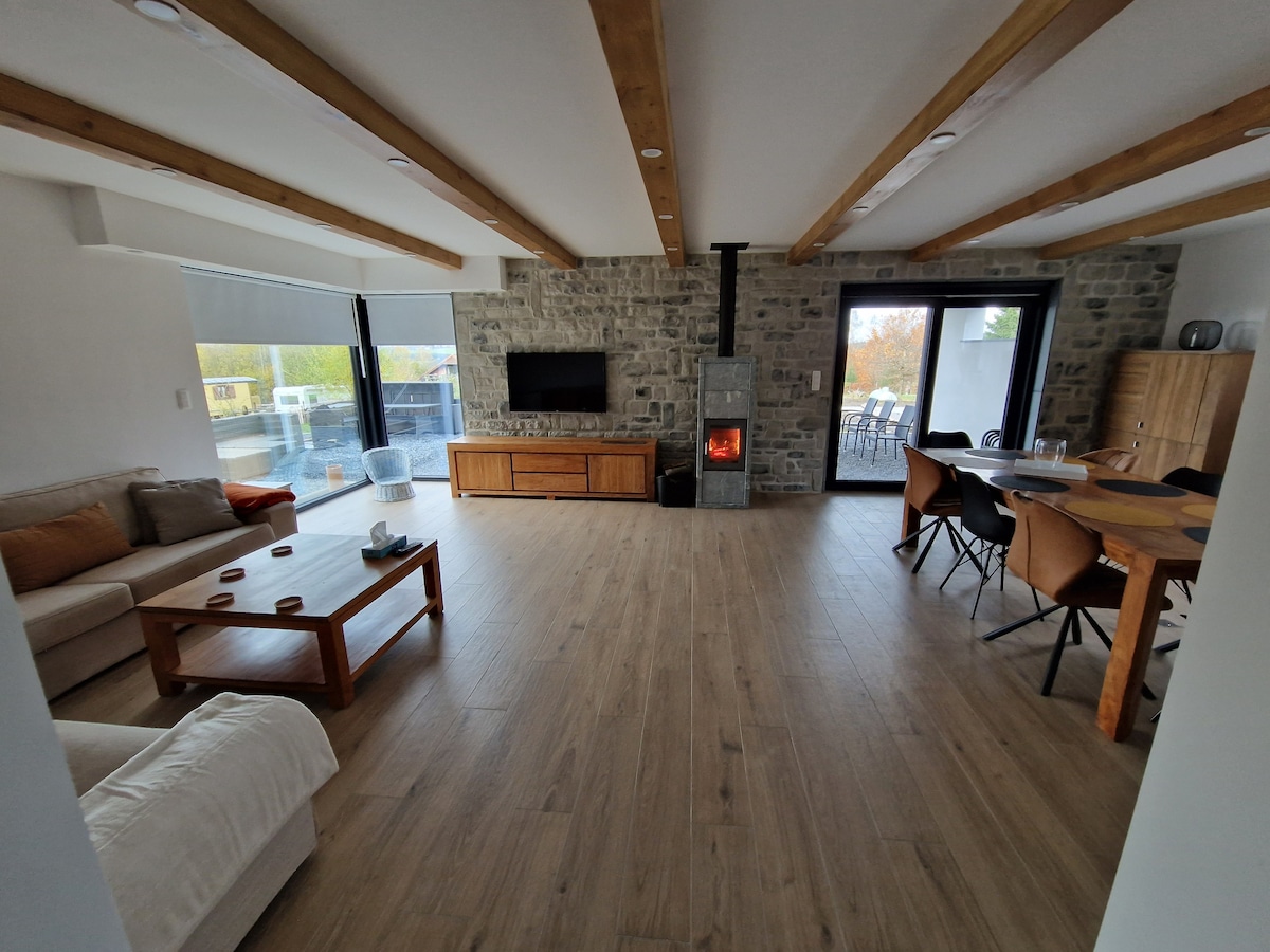 Envie d'une mise a vert? D'un chalet perdu au milieu de nulle part? D'un niveau de finition rarement rencontré dans une location? C'est par ici! Bâti en 2022, notre gîte de 8 personnes ne manquera pas de vous étonner. Le choix des matériaux, l'isolation, l'agencement, sa situation exceptionnelle sont tout simplement uniques en Ardenne. Grâce à notre parc, vous pourrez admirer nos daims depuis le gîte. Nouveauté 2025 : un dispositif de climatisation a été installé.
