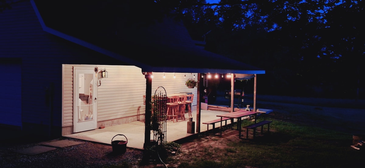 Smješten u Blufordu, ovaj lijepi smještaj s 3 spavaće sobe savršen je za svaku porodicu. Lokacija je dostupna s autoputa 64 ili Hwy 15. Imamo dvije spavaće sobe s bračnim krevetom u svakoj i po jednu sobu s krevetom pune veličine. Jedna od spavaćih soba također ima krevetić. Zatvoreni prednji trijem je savršen za ispijanje kafe, čitanje ili rad za osiguranim radnim stolom. Kuhinja je opremljena osnovnom opremom. TV je povezan s Wi-Fi mrežom. Televizor možete emitirati putem HDMI kabla ili reproducirati DVD-ove.