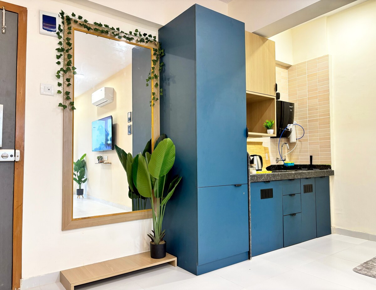 Luksuzni studio u boho stilu s jacuzzijem i vrtom. Miran odmor. Potpuno napunjen Wi-Fi mrežom, JBL 2.1 kućnim bioskopom, BT muzičkim sistemom, Full-HD led TV-om. Elegantno kupatilo s toaletnim potrepštinama. Ostava s priborom za čaj/kafu, RO vodom, mikrovalnom pećnicom, indukcijskom pločom za kuhanje, frižiderom i tosterom. Ograđeni vrt za djecu. Večerajte u vrtu s lijepim vremenom. Jacuzzi ima toplu vodu koja se može koristiti u bilo kojem trenutku. Zajednički sadržaji u sklopu objekta kao što su bazen, igraonica, teretana, mini pozorište, biciklizam i restoran.
