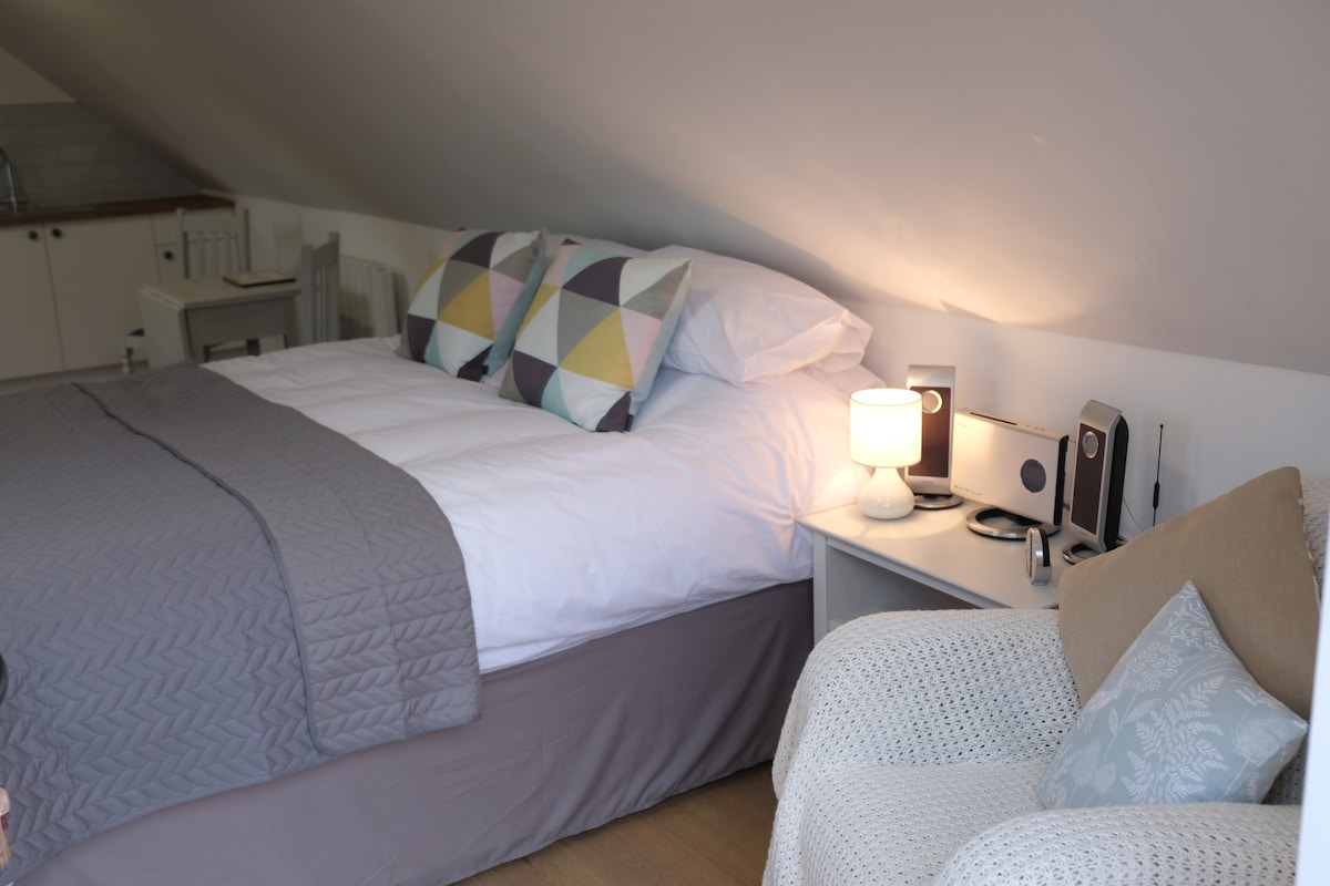 Svijetlo studio potkrovlje za 2 osobe. Prostor za sjedenje u dvorišnom vrtu. Skriven u blizini Warwicka, Leamington Spa, Stratford-upon-Avon. Mini frižider, mikrovalna pećnica, Alexa Dot, TV i superbrzi Wi-Fi, veliko kupatilo s tuš kabinom. Parking van puta. Lokalna prodavnica i 6 seoskih pabova u roku od 10 minuta hoda. Šetnje kanalom i prirodom. Golf i ribolov u blizini. DUGOROČNO OMOGUĆAVA AVAILAIBLE - POŠALJITE MI PORUKU ZA VIŠE DETALJA. Imamo i seosku kuću s dvije spavaće sobe koja se može povezati tako da može spavati 6 osoba.