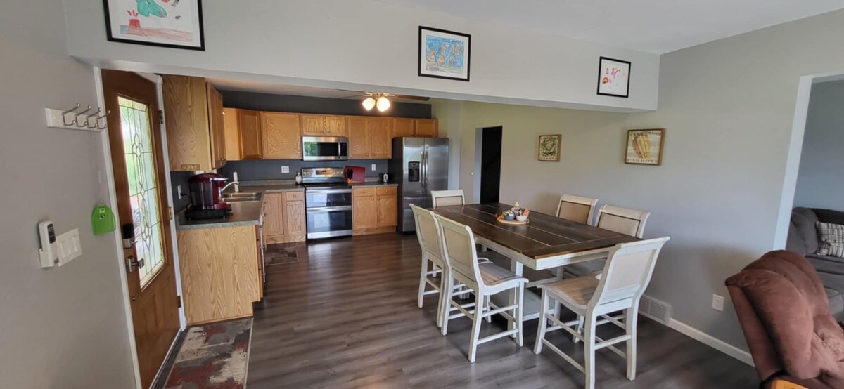 Uživajte u elegantnom boravku u ovom centralno lociranom airbnb-u na solarni pogon. Svi sadržaji doma u rustikalnom okruženju. Pravi drveni zid i limeni plafon. Električni kamin, 65" pametni TV, veš mašina/sušilica, mašina za pranje suđa, šporet, frižider,klima-uređaj i još mnogo toga. Spavajte na udobnom madracu Nectar Queen. Kauč je kauč na razvlačenje s krevetom pune veličine za dodatni prostor za spavanje. Barovi, restoran, prodavnica namirnica i benzinske pumpe u blizini. Samo nekoliko minuta od Dubuquea, skijališta Field of Dreams i Sundown.