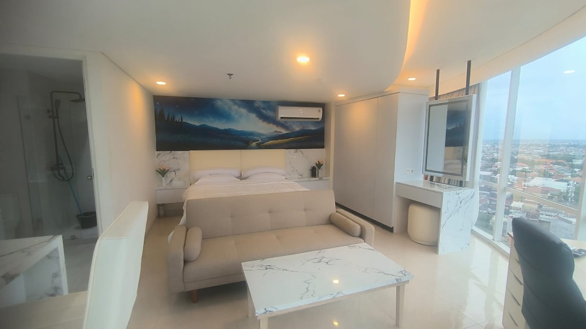 Udoban jednosobni stan s 2 kreveta, u srcu grada, u blizini Univerziteta Diponegoro i nekoliko univerziteta u blizini. Ima dobro prirodno osvjetljenje s velikih prozora i balkona. U kompletu sa zasebnom kuhinjom i mnogim ormarićima za odlaganje. Potpuno novi pametni TV za Netflix, YouTube i Disney Plus. Objekat ima nevjerovatan beskonačni bazen i teretanu na 5. spratu. S nevjerovatnim pogledom.