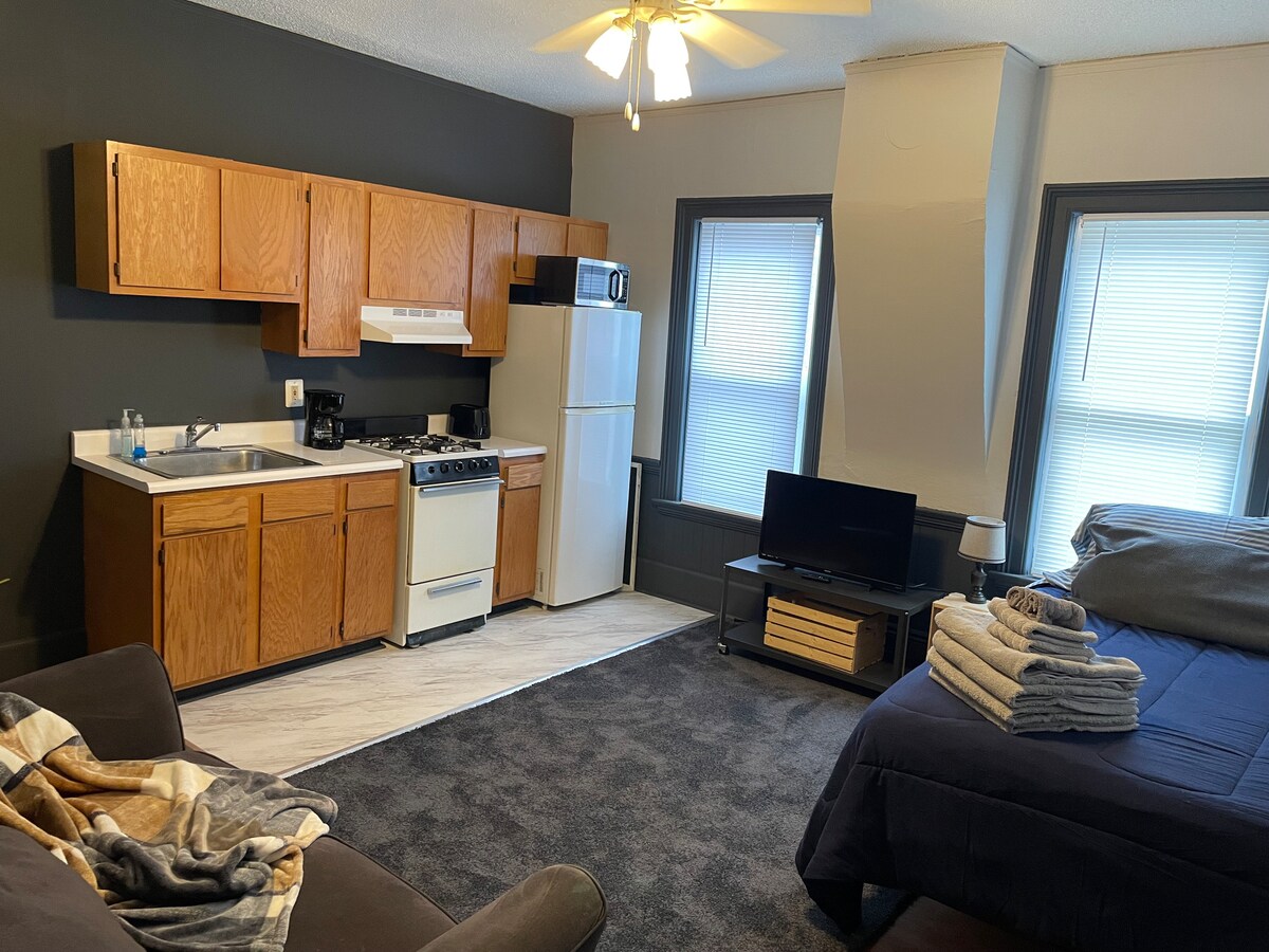 This beautiful and light filled space boasts 12 foot ceilings and exposed brick throughout. Enjoy the well appointed kitchen to cook a quick meal, or walk out your front door and enjoy a plethora of local restaurants at your fingertips! Smart TV has complimentary prime video account for your entertainment! The bedroom boasts a comfortable king sized bed with a small office nook with a desk! Enjoy views of downtown Depot Town and the train from your livingroom window!