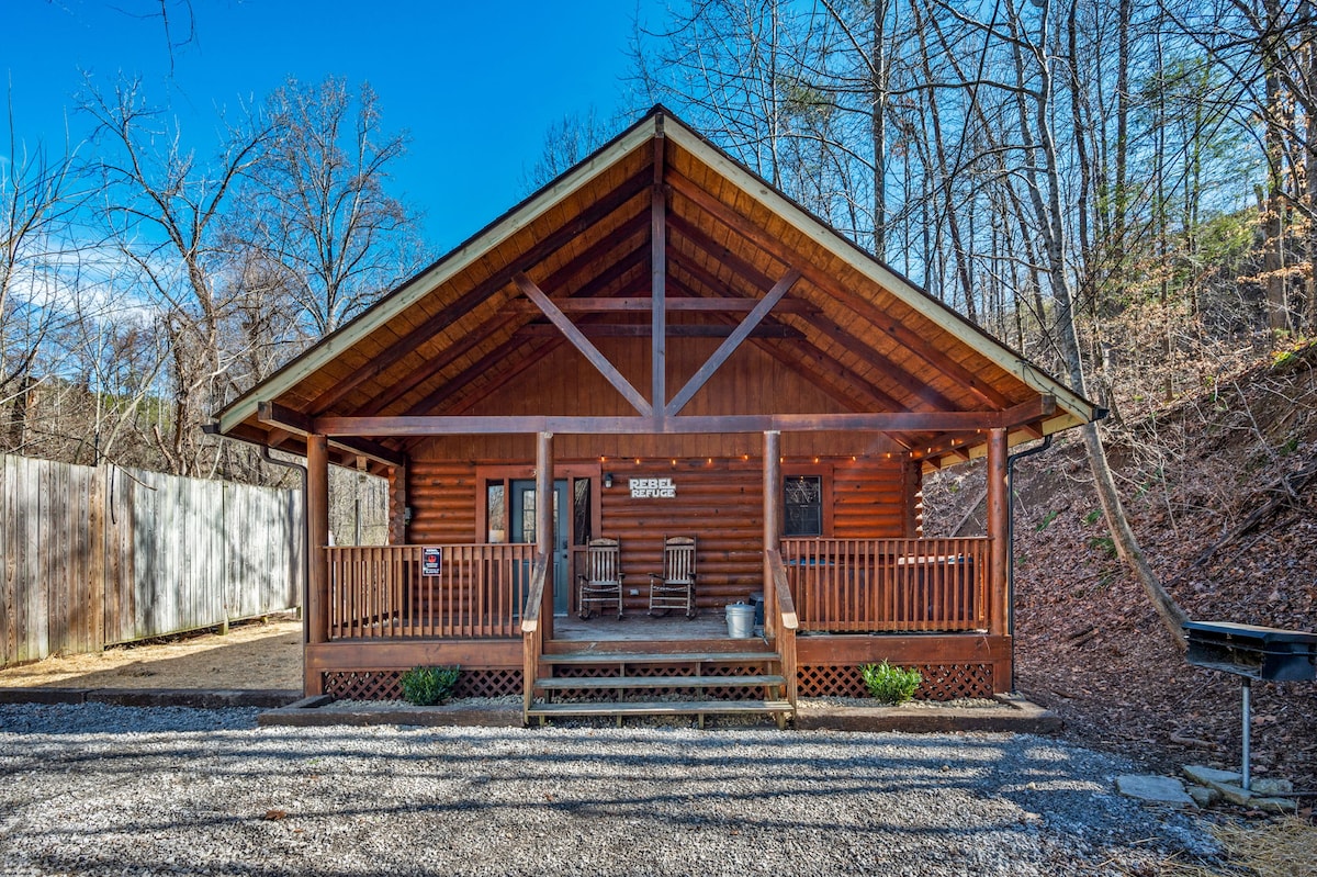 *Hot Tub*, *KING size bed*, Smoky Mountains, just 24 minutes away. Conveniently nestled in between Gatlinburg (15 minutes), and Pigeon Forge & Dollywood just 8 minutes away!! The Tiny Trail Cabin features: ✔ Hot Tub ✔ Soaking tub ✔ Free Wi-Fi • 0.8 Mbps ✔ Back Patio with seating ✔ 30” Smart TV • Netflix, Prime ✔ 1 Bedroom - King size Bed ✔ Private Parking for 1 vehicle ✔ Fully equipped kitchen ✔ 1 Bath (includes essentials) ✔ Sleep 4 people • Futon ✔ Front porch with 2 rocking chairs