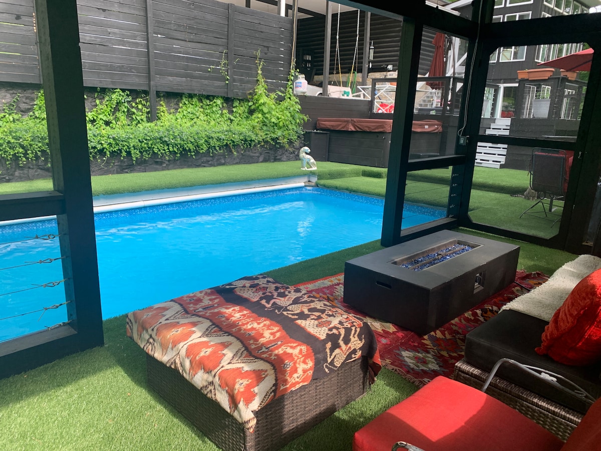Povoljan smještaj na odličnoj lokaciji; samo kratka vožnja do Main Street, Downtown Franklin, Cool Springs Mall, Brentwood, Green Hills, Leiper's Fork i 25 minuta do centra Nashvillea. Mirna brvnara okružena drvećem s ogromnom terasom za zabavu, bazenom i masažnom kadom. Spakirajte se i igrajte, stolica za hranjenje i igračke dostupne na zahtjev (uvijek pratite malu djecu pored bazena/terase). Novi frižider, mašina za suđe, indukcioni šporet (2024). Stariji, živi u njemu i volio je dom.