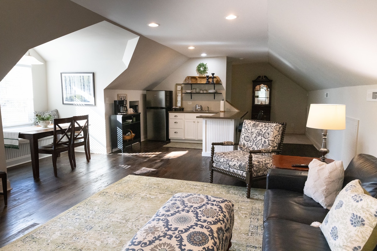 I turned my house into a duplex, by turning a very 70s addition into a private, cozy, and charming space. There's a kitchenette, a dining area, and a sitting area, a bedroom, and a bathroom. The location would be ideal for someone who needs quick access to Duke Regional Hospital (4 minutes away) or downtown (6 minutes), or someone who wants to keep up a running habit (the greenway is nearby). A taqueria, a grocery store, and a coffee shop are within walking distance.