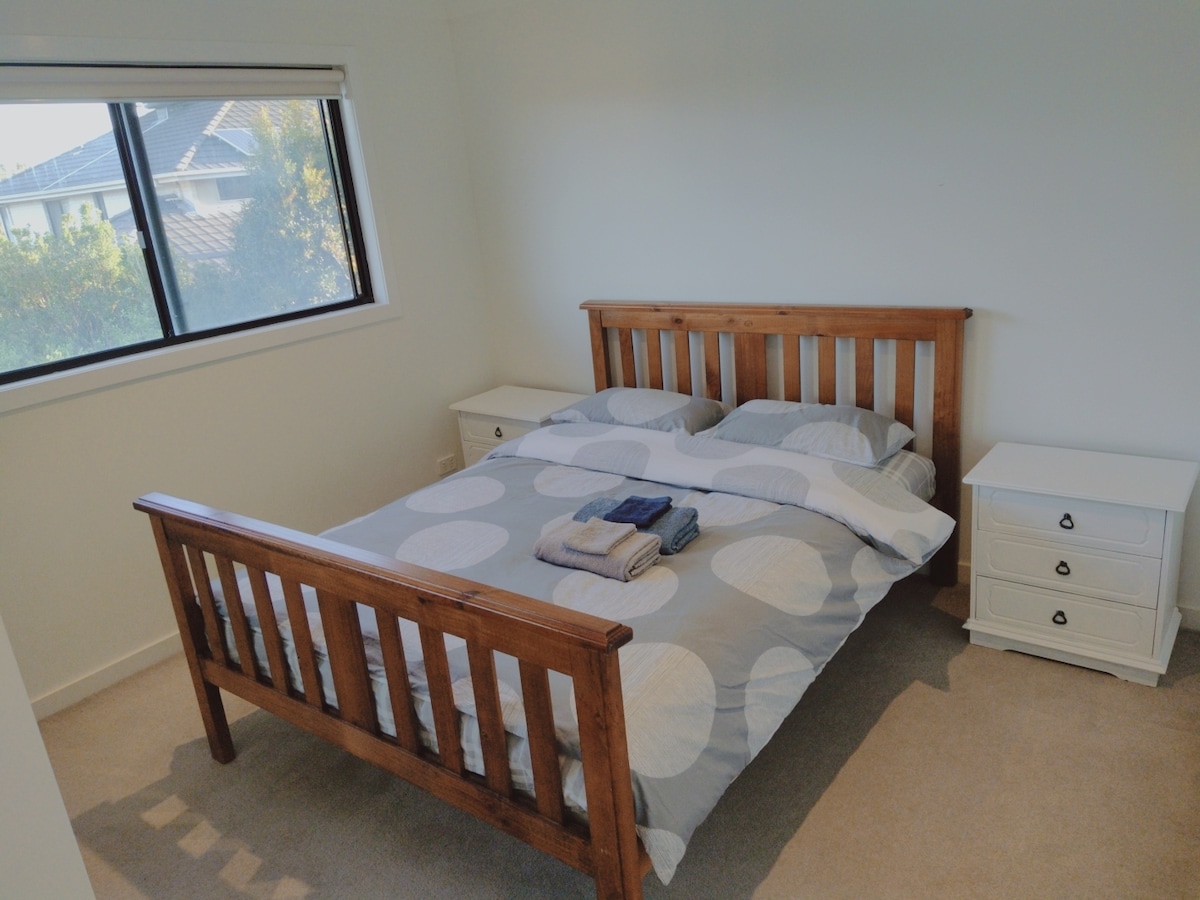Your modern lakefront retreat! This sleek, two-storey home sleeps 5 and is perfect for a family or group getaway. Inside, you'll find a spacious living room with a comfortable 6-seater couch and study nook. Upstairs, two queen bedrooms await. A third foldable bed is available on request. The home offers beautiful front lake views. For outdoor living, the large, private backyard is your space for grilling on the 6-burner BBQ and relaxing in the quaint seating area. We can't wait to host you!