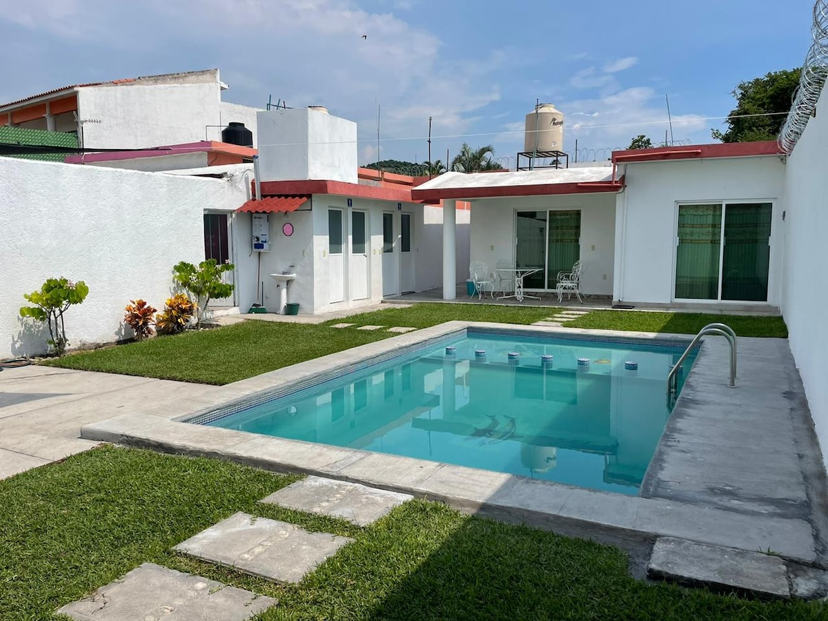 Kuća u prekrasnom privatnom smještaju sa svime što možete provesti odličan vikend u porodičnoj atmosferi. 15 minuta do Cuernavace U privatnom prostoru ima vrt od 60 m2, trpezariju, kuhinju, frižider, ventilatore, kablovsku TV i dvije spavaće sobe. U zajedničkim prostorijama se nalazi veliki bazen s chapoteaderom, palapom, roštiljem i prostranim vrtovima, kao i osvijetljena fontana. Parking za 1 automobil. Usluga kablovske televizije i WI-FI. Zabave nisu dozvoljene.