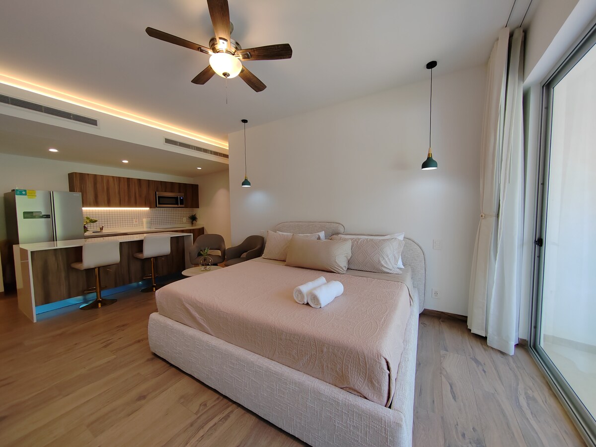 Smješten u najljepšoj ulici s drvoredima u Playa del Carmen, s nevjerovatnim kafićima, barovima, restoranima, lokalnim trgovinama i plažom, ovaj jedinstveni + moderan 1-sobni stan je blizu svega, što olakšava planiranje vaše posjete. Prošetajte do plaže na jedan dan, provedite večer šetajući 5. avenijom ili jednostavno uživajte u apartmanu inspirisanom nautikom + privatnoj terasi, ili se popnite na svoj predivni krov i uživajte u spektakularnom pogledu na more dok uživate u baru + bazenu.
