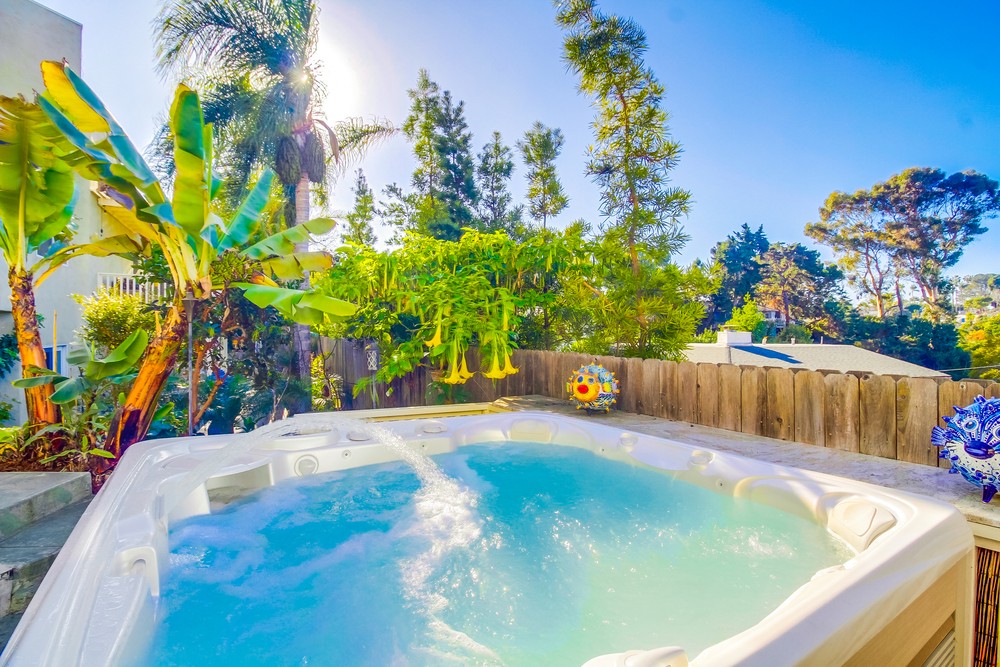 Beside a pocket park on the edge of the Pacific ocean, this La Jolla Airbnb with 595 sq. ft patio offers salty air from the ocean about 100' away with fascinating tide pools. Too dangerous for kids here, sorry, but room for surfboards and bicycles, and your spa awaits. No beach access. Must scramble down park path to the stony shore, but a sandy beach one quarter mile away. En suite/king bed, dog fee $55 per night; if you hear potential construction noise, we will discuss the partial refund.