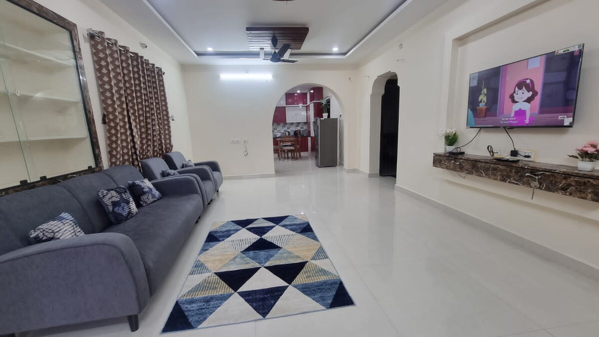 Welcome to your perfect spacious & peaceful 1 BHK Flat on 2nd floor to accommodate 3 guests. NOTE: There is NO LIFT This modern house offers a comfortable and stylish stay in the heart of the city Hyderabad. Enjoy the spacious kitchen and dining area. This home is designed for comfort and convenience with easy access to city. Book your stay today for a relaxing experience! Key Features: 1 bedroom & bathroom, kitchen & dining, Living Room with Sofa Bed, Smart TV, Wifi, CCTV, front Patio