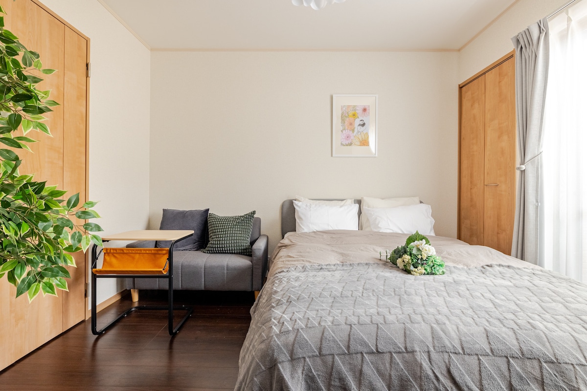 Novo otvoreno u maju 2025.! Hachimanhime je smještaj na drugom spratu male zgrade u stambenoj četvrti u Soki, prefektura Saitama, s dugom historijom.To je prostran smještaj s odvojenom kuhinjom, velikim TV-om i dnevnim boravkom s kaučem od 41 m2.Imat ćete cijelu kuću za sebe u privatnom prostoru. 🍳 O objektu U privatnoj spavaćoj sobi se nalaze 2 bračna kreveta, a u dnevnom boravku 1 bračni krevet gdje možete razgovarati sa svojim prijateljima.Tu je i kauč na razvlačenje, tako da možete udobno boraviti s porodicom ili grupom prijatelja od 4 do 6 osoba. Ima sve što vam je potrebno za svakodnevni život, uključujući i mašinu za pranje veša. 🛒 O okolini U blizini se nalazi 24-satna trgovina.Veliki supermarketi su također na pješačkoj udaljenosti, što ga čini vrlo praktičnom i jednostavnom lokacijom za život. 🚃Pristup Najbliža stanica je stanica Nitta na liniji Tobu Skytree.Udaljen je oko 30 minuta direktno od Uenoa, a možete ići i direktno u Akihabaru i Ginzu, što ga čini pogodnim za razgledanje i posao. Potrebno je 13 minuta hoda do najbliže stanice, ali na putu se nalaze supermarket i pekara koju vodi pekarska fabrika, što je zgodno.