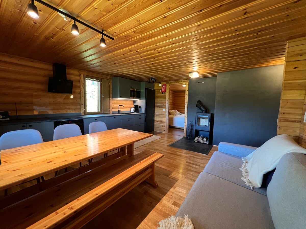 Osjećajte se ugodno i opušteno u ovoj prekrasno renoviranoj drvenoj dvojnoj brvnari. Savršen pogled na Ylläs-fjell. Atmosferska sauna i kupatilo. Potpuno opremljena kuhinja. Odvojeni toalet. Besplatan parking. Nema svjetlosnog zagađenja, dobro je za gledanje polarne svjetlosti! Dvije spavaće sobe, svaka s bračnim krevetima od 160 cm. Također, krevet na sprat (savršen za djecu ili djecu). Dostupan je dječji krevetić. Pješice do prodavnice hrane, restorana, kafića, autobuske stanice. Skijaške staze 400m. Restoran 700m, prodavnica 1 km. Gondola 5 minuta vožnje.