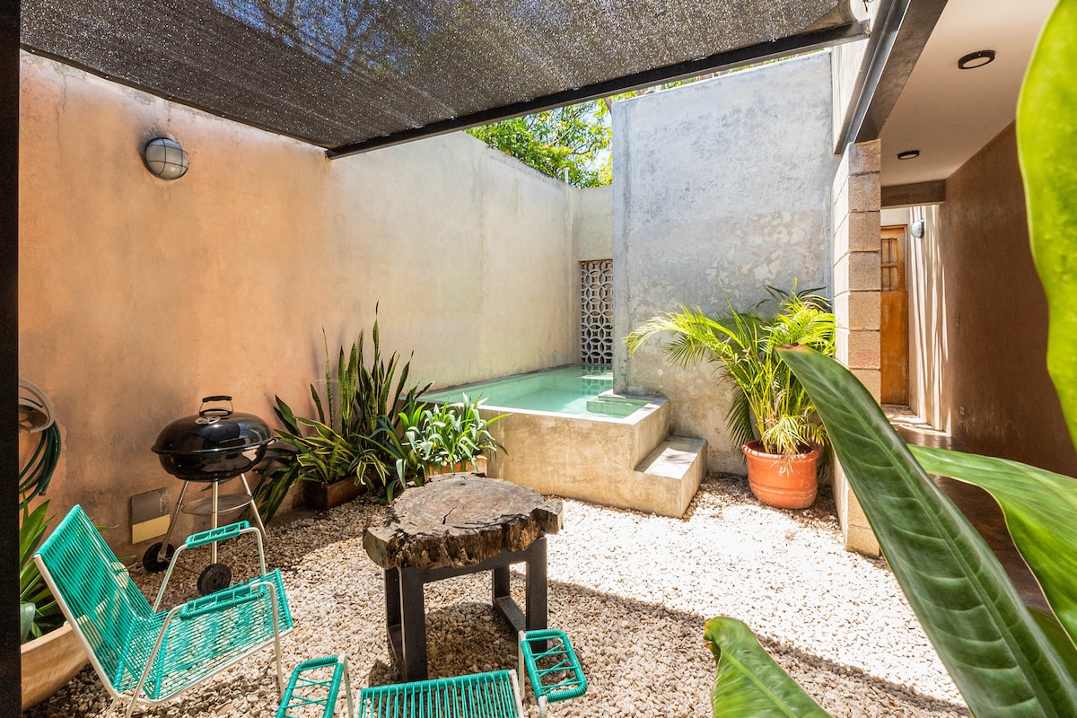 Idealna baza za istraživanje Yucatana ili opuštanje u prekrasnom okruženju. Smještena u mirnoj ulici u historijskom centru Meride, kuća može primiti do 6 gostiju u tri spavaće sobe, ima zasebnu kancelariju/TV sobu za rad ili igru i veliku kuhinju/dnevni boravak/trpezariju s mnogo prirodnog svjetla. Možete se opustiti ispod palpe bazena ili u centralnom dvorištu prekrivenom lozom, imati roštilj na terasi na krovu ili uživati u zalasku sunca iz zvonika.