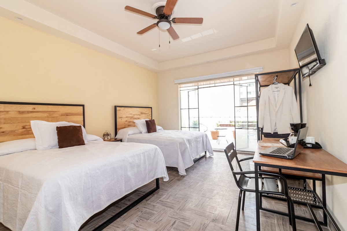 Disfruta de tu propio rincón privado en el corazón de León. Esta suite destaca por su terraza exclusiva, un espacio acogedor y tranquilo diseñado para relajarte al aire libre después de un día de compras o trabajo. • El Espacio: 2 camas Queen y mobiliario cómodo. • Terraza: Ideal para un café con total privacidad. • Seguridad: Estacionamiento cerrado visible desde tu suite. Plus: Baño impecable (presión y temperatura garantizada) y acceso a cocina equipada por piso.