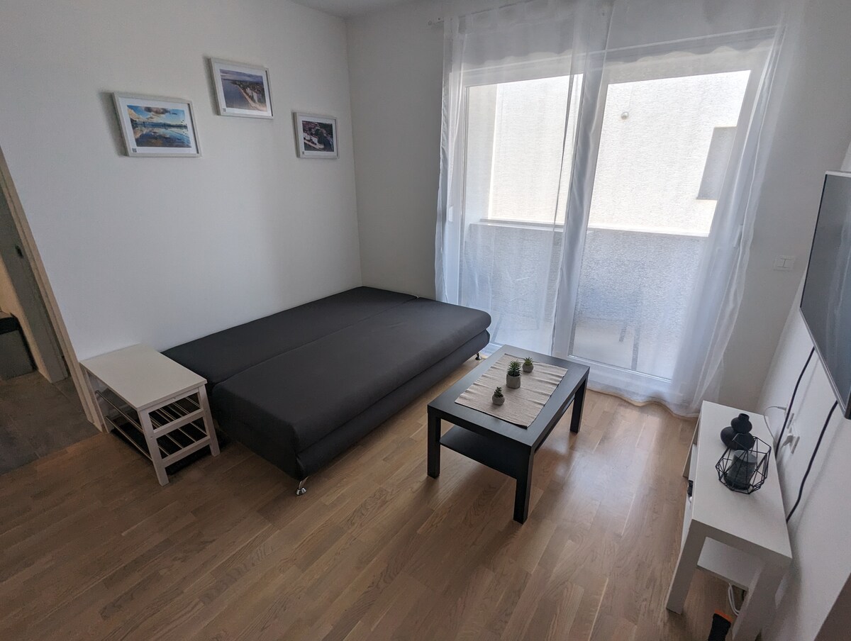 Stan ima 44 m2. Nalazi se u novoizgrađenoj zgradi. Sastoji se od velikog dnevnog boravka s kuhinjom, kupatila i 1 spavaće sobe. Stan je potpuno opremljen (mašina za pranje veša i posuđa, frižider i zamrzivač) i za duži boravak gostiju. Tu je i besplatan Wi-Fi internet i klima uređaj. Idealan je za dvije osobe. Blizina plaža. Blizina centra grada, kulturnih i rekreativnih sadržaja. Stan je udoban, raspored stana je praktičan. Možete uživati u svojoj privatnosti.