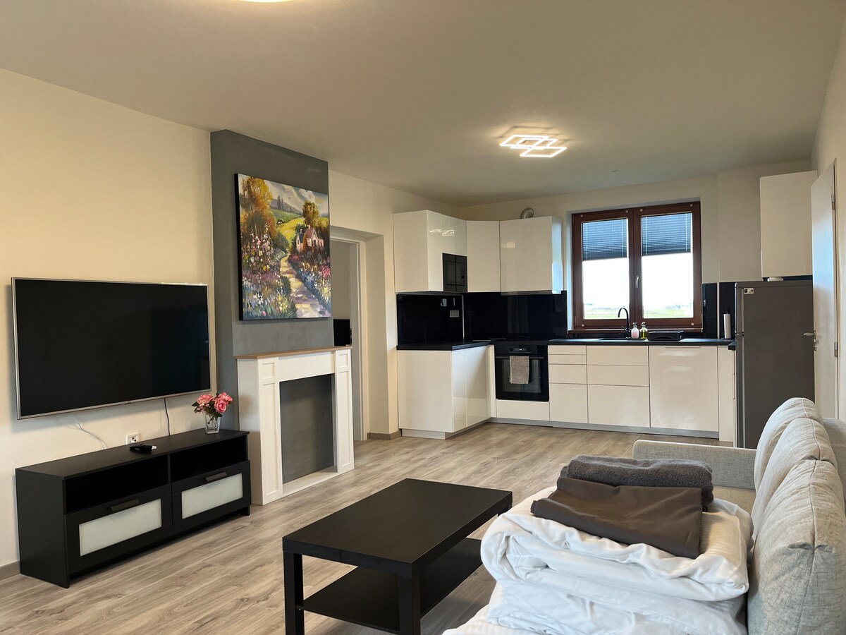 Svijetao, prostran i potpuno nov stan udaljen 15 minuta od centra grada i minut hoda od obale Vltava će vas iznenaditi svojom lokacijom i aktivnostima. Postoji područje za golf i tenis u neometanom području, možete iznajmiti brod, kajak, dasku za veslanje ili čak bicikl, i zeleni restoran s pogledom na rijeku. Moguće je parkirati oko zgrade bez zona i naknada. Tramvajska stanica oko Vltave do centra starog grada udaljena je samo minut hoda i nudi lijepu vožnju.