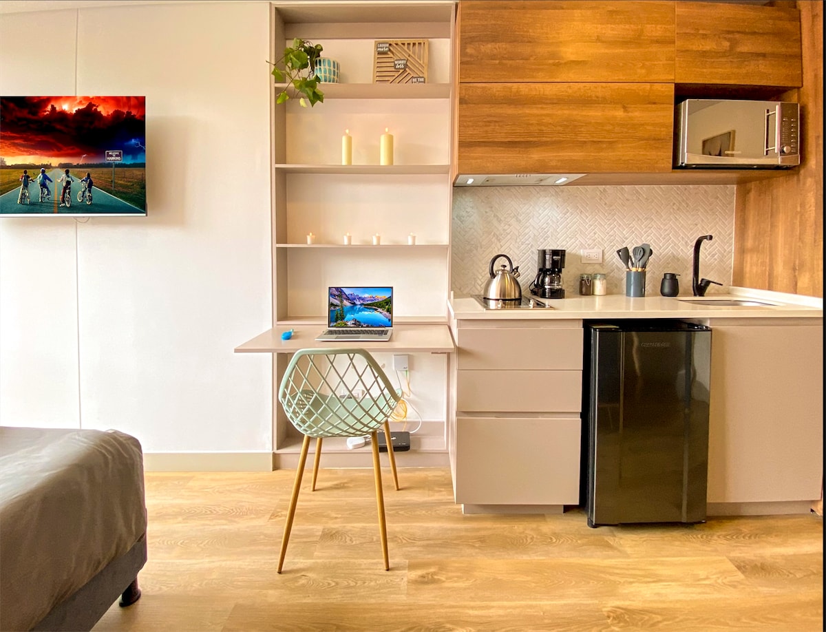 Holtz Luxury Loft with amazing view of mountain and City Loft type Holtz- Wonderful view. Queen size bed, 400 thread count 100% cotton linens. Space to work with high speed Wifi + equipped kitchen + balcony. Building with incredible common areas; Pool, Jacuzzi, Gym, Yoga, Sauna, Pilates and Trx area. Golf Simulator*. +Billiard table +Co-working and Roof Top for bbq. In the same project on the first level of the building you will find a restaurant area.