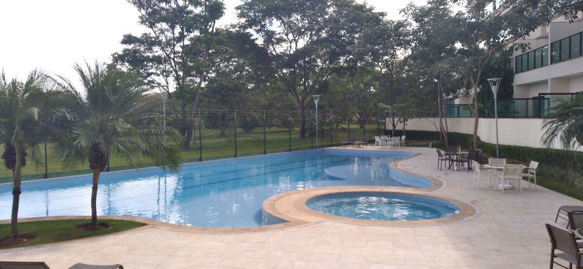 Mirno za rad i odmor. 9 minuta od aerodroma, 4 km od jezera Paranoá i pored Casa Parka i Park Shoppinga. Struktura s 4 zvjezdice s 4 bazena (polu-olimpija je grijana) saunom i teretanom. Poslovni centar, recepcija i restoran su dostupni 0-24. Apto ima mikrovalnu pećnicu, šporet, mini bar, filter za vodu, aparat za kafu, lonce, blender, aparat za sendviče i pribor za jelo. Kupatilo je opremljeno sušilom za kosu i sigurnosnim šankom. Dodatna deka, pegla i daska su u ormariću. Vrlo lijep Wi-Fi, a TV je pametan.
