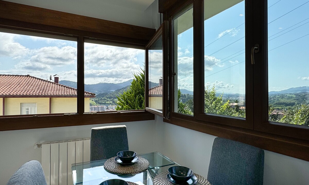 Apartamento estilo industrial. Amplio salón-comedor con ventanal y luminosidad que da acceso al balcón, con vistas al río Oria y a la montaña. Balcón con orientación suroeste equipado con mesa y sillas para poder disfrutar del atardecer. Cocina totalmente equipada con barra que proporciona zona de convivencia. Dos dormitorios con cama de 135cm, mesitas, armario ropero y ventana, una de ellas exterior. Ventanas y puertas con persianas y mosquitera. Baño con ducha. Entorno con todos los servicios