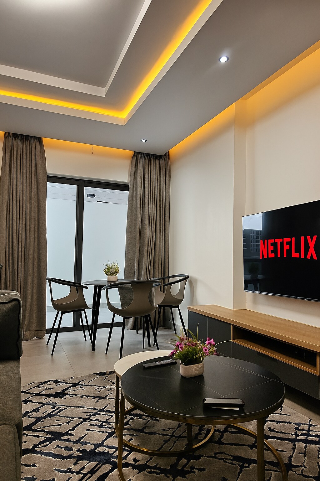 Spavaća soba Košarkaški skok Privatni balkon Optički Wi-Fi Mašina za pranje veša Namještena dnevna soba Potpuno opremljena kuhinja 2 toaleta i 1 kupatilo PlayStation 5 (FiFA,Hit Man, MK) Blizina restorana i prodavnica Čista i svježa posteljina i peškiri 2 klima-uređaja na platformi Solar&Inverter Odlična služba za korisnike i podrška Vrata s lozinkom i kamerom na ulazu 65 i 55 Smart TV (Prime, Netflix i DSTV) Mirno, sigurno i lijepo okruženje Struja 0-24 (solarna energija, inverter i generator)